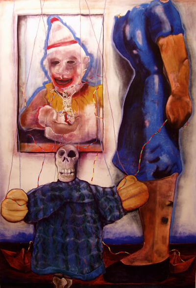 Seasoned local artist James Freeman, known for his botanical abstractions and grid-based collages turns emotive, exhibiting paintings and drawings of goofy toys, puppets and dolls, in the 1301 Gallery. The large, colorful paintings, intensely rendered chalk pastels and mysterious graphite line drawings of macabre figures are said by the artist to represent his working interior dialogue as he creates —“frustration, happiness, anger, confusion, global goofiness…”