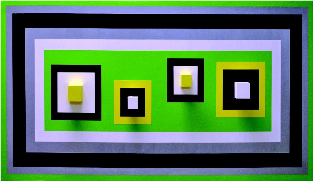 Immediately when viewing his “Happy Boxes” and “Boxes” the relation is clear; the wood boxes painted with acrylic on masonite are stripped of all unnecessary features, leaving only intense, brightly-hued rectangles and squares. The balance and composition are visibly perfected, an ironic play on the movement that aims to focus only on the identity of subjects.