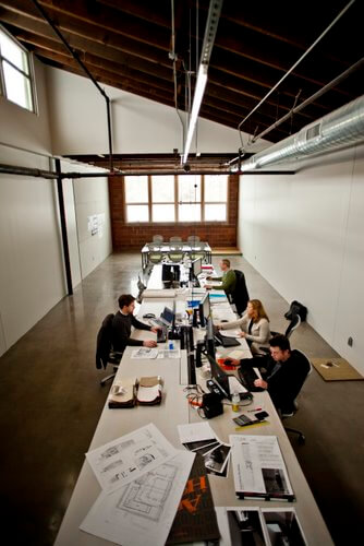 John Henry is part of a design team of young men who look like members of a contemporary band; their focus a simple look with a dash of the unexpected is reiterated in their downtown studio. Cool concrete floors, a dash of red from the sofa, and an elevated stage area with the “What Cheer” logo in the window catching sunlight brings well, cheer to the workspace.