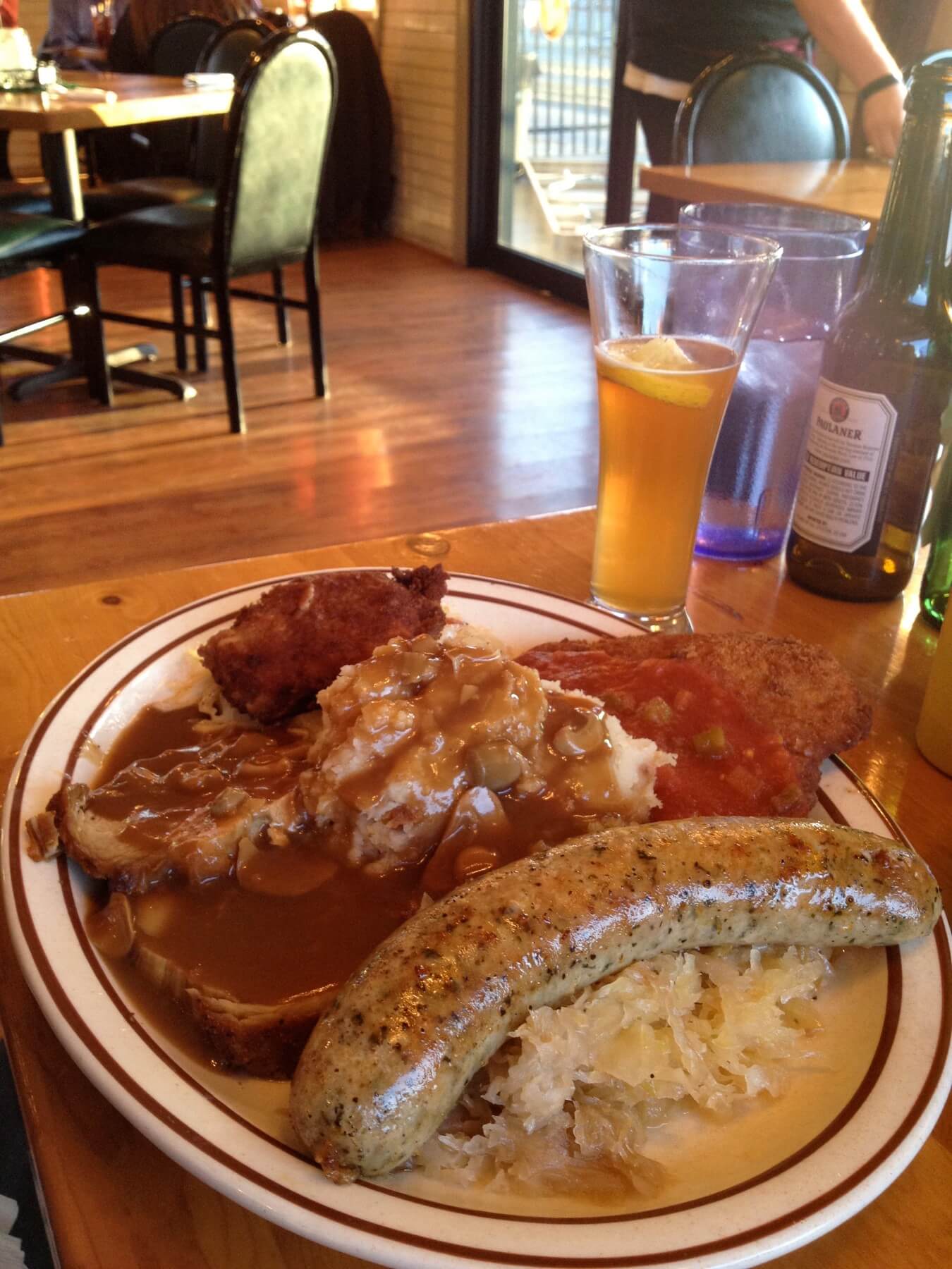 The Tour of Germany ($19) was breathtaking to behold. The house-made bratwurst, coarsely ground with herbs and caraway seeds, came perfectly browned on the outside. So flavorful it was, that I preferred it without the spicy horseradish mustard. The pork schnitzel was nicely tenderized, and the breading wasn’t too thick. Topped with a Zigeuner sauce of sharp green bell peppers and tomato paste, it was another highlight of the meal. A breaded pork cutlet, pork roast with mushroom gravy, mashed potatoes, creamy Bavarian cabbage, and a load of sauerkraut rounded out the plate. If you don’t have a love affair with pork, they also serve a vegetable-stuffed cabbage entrée, among other vegetarian dishes.