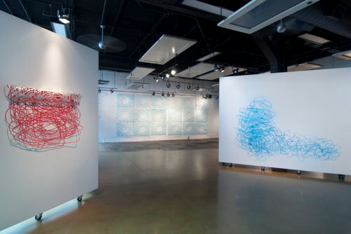 Her sincerity, too, is evidenced in her intense craft ability. Hundreds of tiny-sliced lines of paper appear to be drawn strokes in “Waves 1-5.” Blue, red and silver ink and Mylar dots on the tyvek paper make it cool, and the sculpted form of waves roll off the walls that are also situated to off-shoot from each other.
