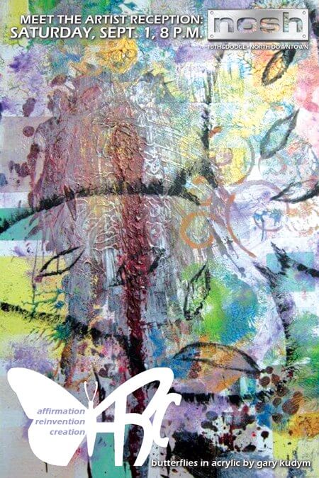 As part of Omaha Creative Week, new artist Gary Kudym unveils his acrylic paintings of butterflies that helped him metamorphosize his life. “ARC,” the title psyedynym stands for “Affirmation, Reinvention and Creation,” the three main inspirations of the series which is on display for the first time. Proceeds of the art will benefit the Metamorphosis Fund, easing the financial burden on cancer patients and survivors who need goods and services to aid in their recovery. Complimenting Kudym’s work is original jewelry by Carmella’s Closet.