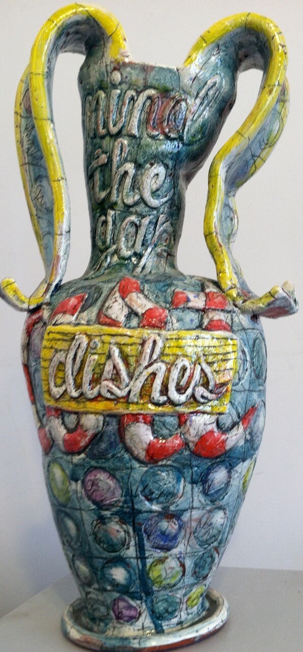 James Freeman is known for his exploration with various two-dimensional media to create dreamlike figures. For this show the currently Omaha-based artist is exhibiting surreal figurative drawings in graphite, charcoal, pastel and acrylic on paper he describes as a sort of “inner mind-scape; snapshots of loosely drawn or painted faces.” Ceramicist Susan McGilvery is showing a series of her stylized, carved and colored vessels based on the classical amphora shape. Words as part of her gestural design, like “May we,” “cute” and “blue fish” twist in and out of legibility in her carefully crafted clay works pushing her unique aesthetic and the meaning of each piece.