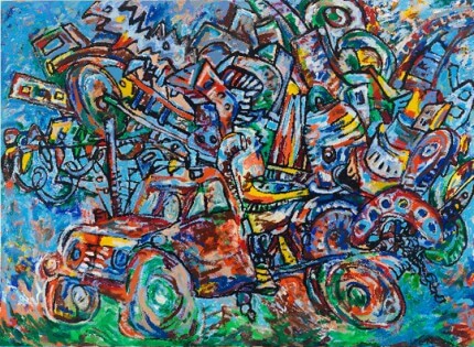 Conversely, “Hero” is felicitous, with its truck chugging across a pink landscape, with a red and blue mass of stuff springing out of its bed in every direction like a bad hair day. Himmelfarb’s animated drawing and brushwork accentuate the precarious balance of its cargo. It partakes equally of cartoon animation as it does, say, of early twentieth century Fauve painting.