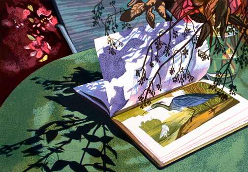 It is a step-by-step layering process. Each transparent color printed exponentially builds the full palette of the finished image. The light, energy, and saturated color of Fish’s original watercolors maintain a satisfying equivalent in Stewart’s rigorously printed editions.