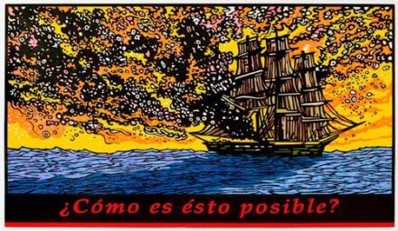 It is immediately clear in the experience of a Poskovic print that what you’re getting is not entirely what you’re seeing. Gazing at one of these prints becomes an apprehension of the unseen and unknown. The unknown being what came before, and after, this particular moment captured in an amalgam of image, text, paper, and ink. “If This Be Not I in Cream, Gray, and Dark Orange with Red” is an image of a 19th C. sailing ship on a deep blue sea with an orange, yellow, black, and white filled sunset or sunrise. The black and white text beneath the image says Cómo es esto posible? How is this possible?  Add to this an exceptional degree of skill and craftsmanship, and the viewer is still not sure. How is “what” possible? That’s the conundrum and beauty of it all.