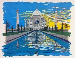 The artist does justice to the ethereal beauty of this tomb to a doomed love in what is easily the most complex and multi-layered piece in this show. Yet even more impressive is the highly decorative reflective pool that mirrors both the Taj Mahal and the fiery sky behind all awash in a palette of shimmering primary hues.