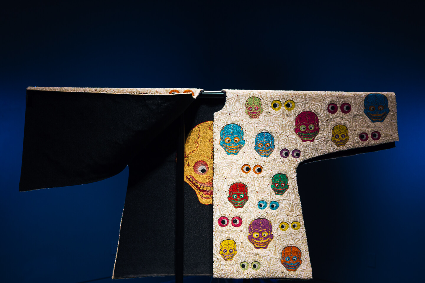 Study reveals these motifs related to Tantric Buddhism, where they are regarded as symbols of the destruction of the individual ego, which opens up a person to the possibility of spiritual rebirth. To the non specialist, they also call to mind Mexican Day of the Dead figures, Lucha Libre wrestler’s masks, and anime characters. No matter, the resulting garment is splendid, fun and a little macabre.