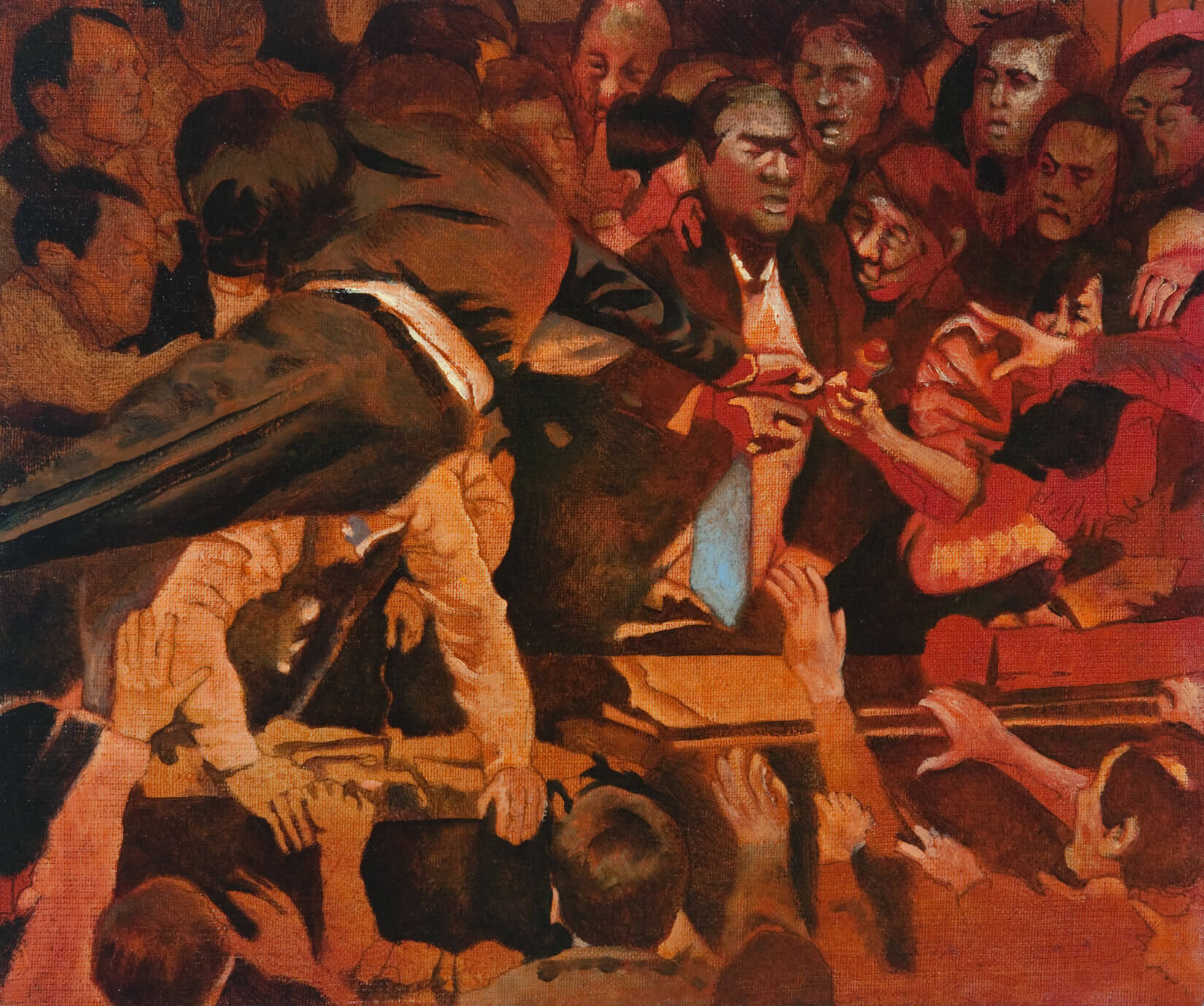 Anway will show large format watercolors and oil paintings that feature scenes of brawls and other dense crowd scenes inspired by events broadcast on the 24-hour news cycle. Buschur’s paintings are studies of volumes of a different sort—accumulations of items in junk drawers become her de facto psychological and consumerist portraits of family and friends.