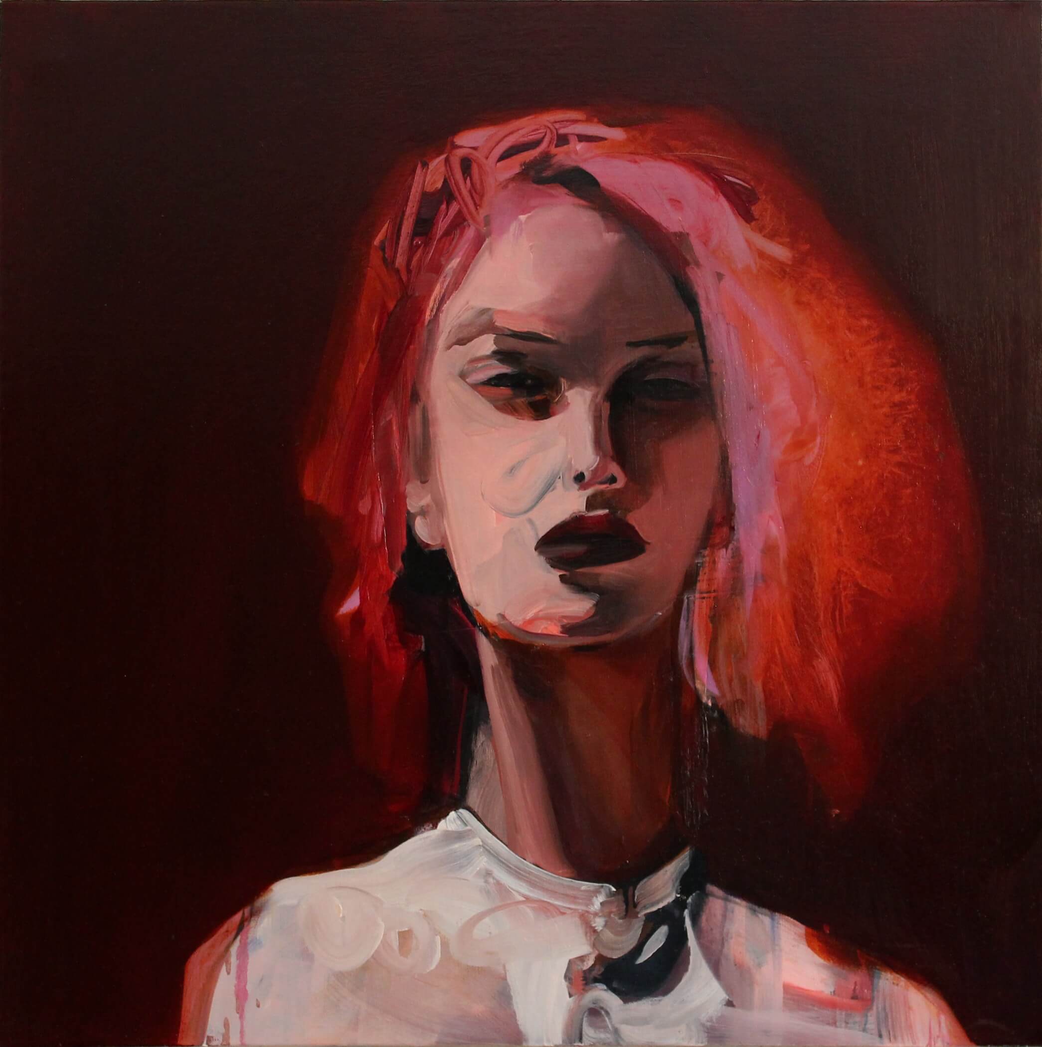 Pfarr then creates images in oils responding to the disparate paper fragments. Edges morph, limbs distort, and paint melts into an incongruous collection of images of women, which seem to speak to the anxiety prevalent in today’s world.