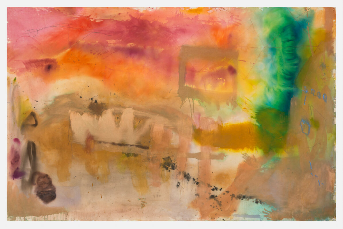 Her preference for saturated color poured and stained into unprimed canvases results in abstract compositions with the feel of large-scale watercolors. The addition of gold pigment in several works gives them additional pop under the intensity of gallery lighting.