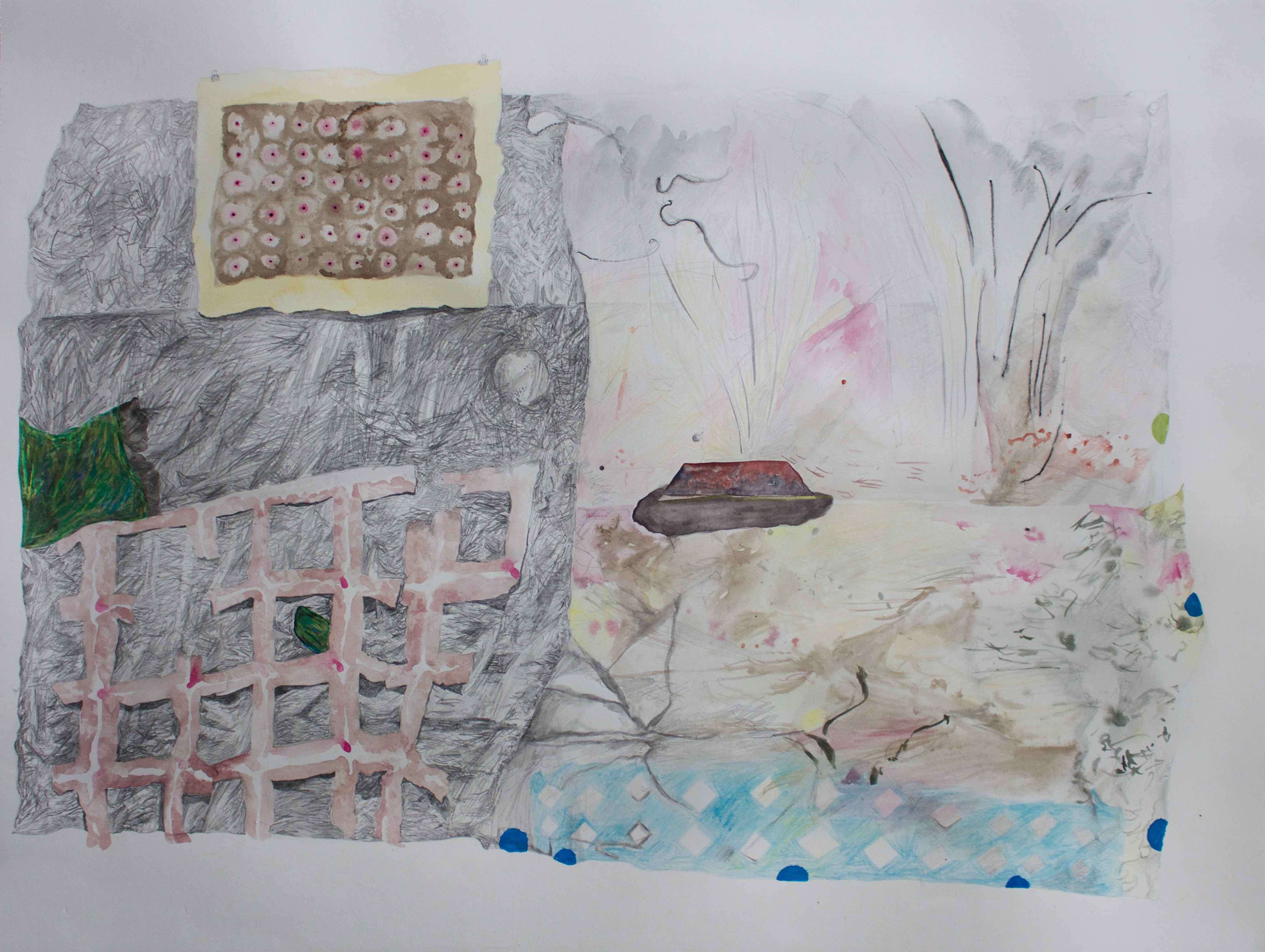 A third piece that must be mentioned is O is for Outside, a delightful and disturbing jumble of broken watercolor and ink sketches, terminating with a goggled swimmer, on top of blocks of color.