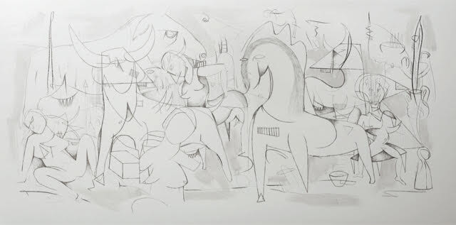 He takes a departure from his signature style in his new solo exhibition at Garden of the Zodiac Gallery with new mixed-media drawings describing figurative scenes in mural-like presentations.
