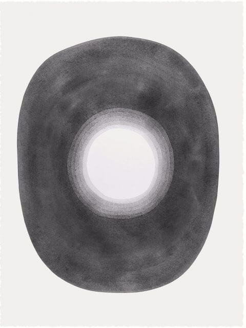 Each batch is mixed individually and the charcoal particles behave differently in the water suspension, resulting the subtle variations that occur when painted on paper. The works are alternately delicate and bold, and the forms seem to float on the paper’s surface.
