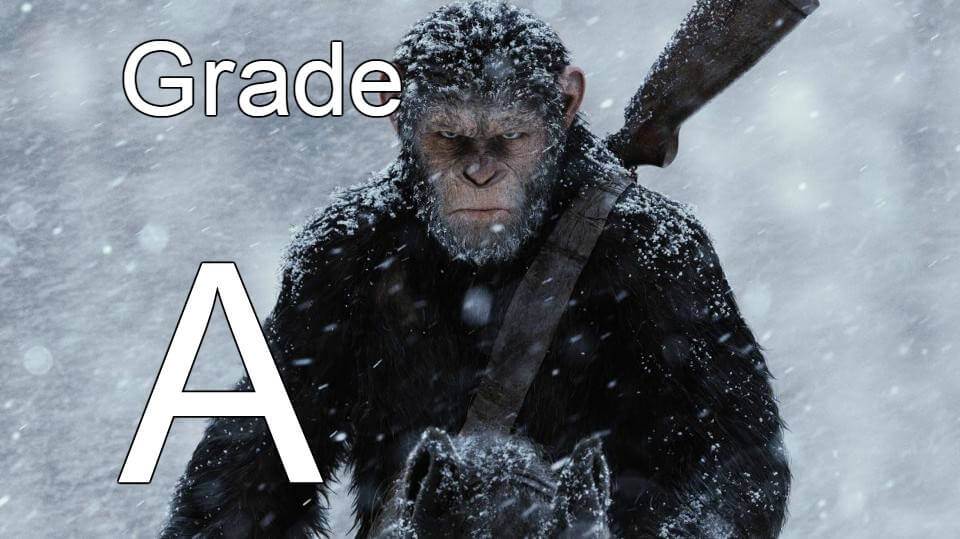 So the nerd deep down in my heart rates War an A+++ times infinity and beyond. However, the nerd bubbling just beneath my surface gives War a much more reasonable but still ecstatic A. All you need to know about the film is right there in the title, although the story might unfold a bit more somberly than you’d expect. Most blockbusters are so tightly edited these days that it’s nice to see one finally give scenes some breathing room. The mo-cap experience is so much more rewarding when the story slows down long enough for you to spend some downtime with these characters.