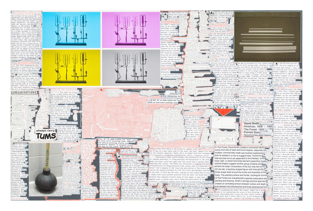 Both artists use language and map imagery to create a conceptual analysis of how images and language from the media work together to convey information. Sontheimer’s text-based work focuses on his internal dialogue whereas Dvořák looks externally to cartography to create an abstracted, reduced language.