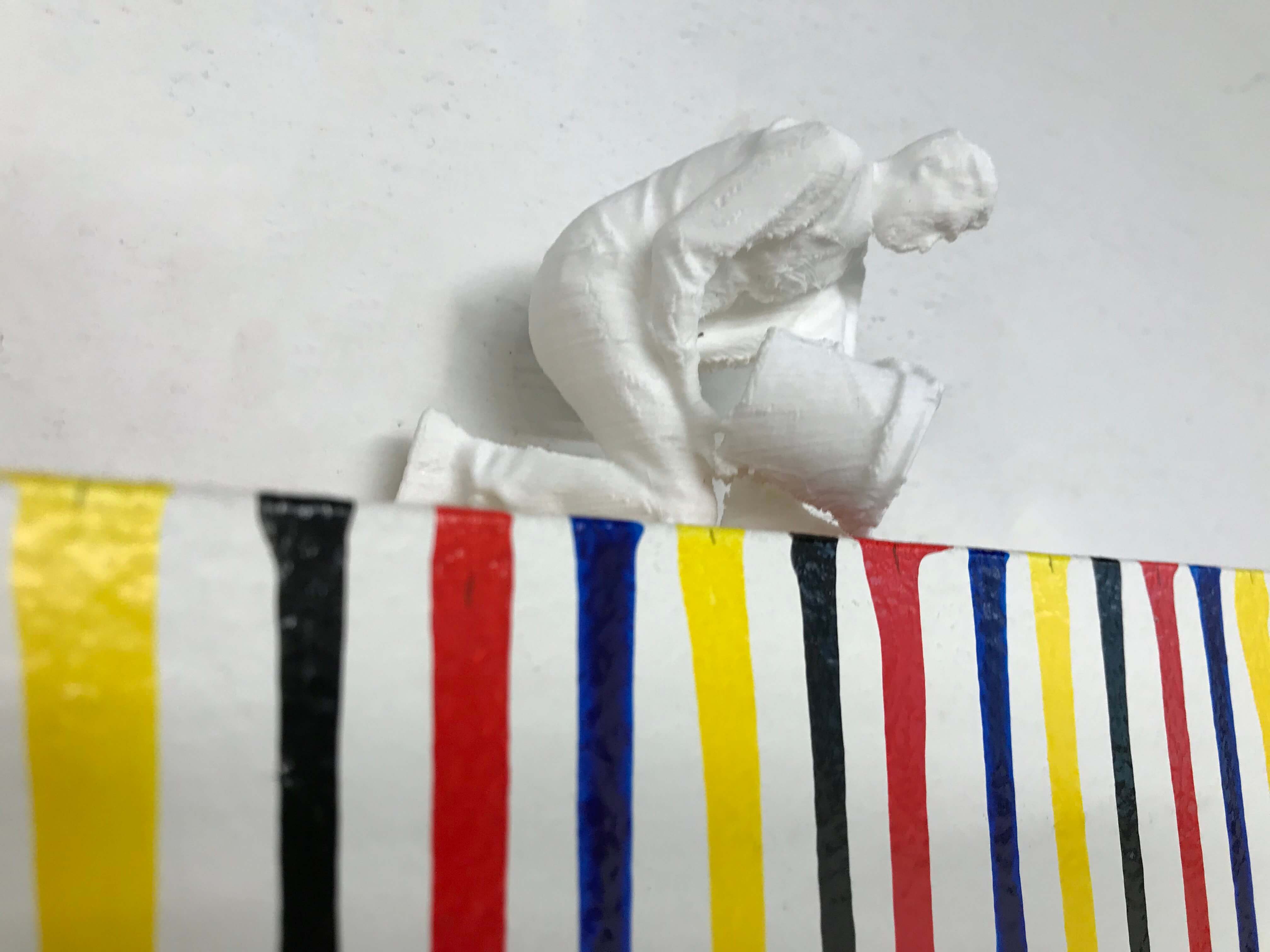 Meanwhile Burmeister invades the gallery with his mini-guys affectionately known as “Vermin”. These bronze and clay figures appear in installations on and off the wall that actively involve them in humorous scenarios.