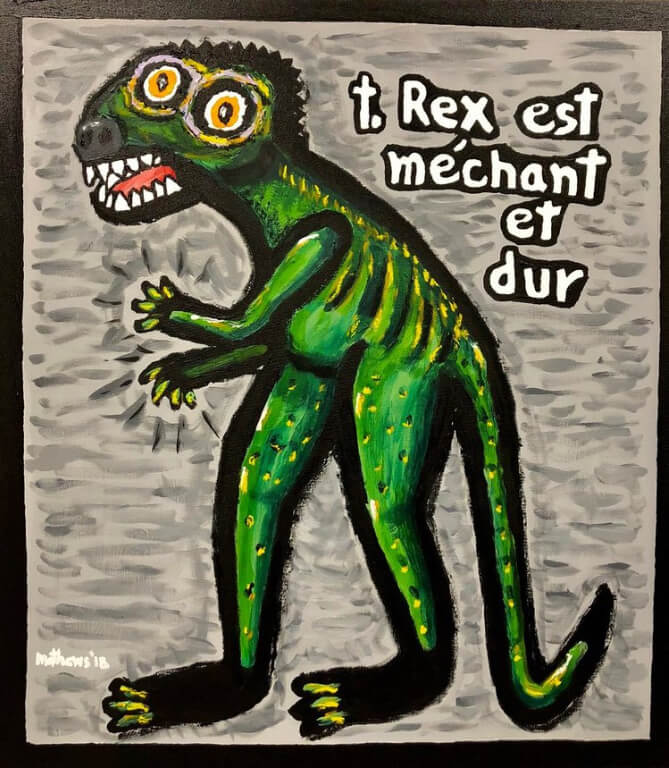 If we could talk to the animals, they might say “T-Rex est mechant et dur” (T-Rex is wicked and hard) as does the caption for the aforementioned dinosaur in In Come the Animals,a new solo exhibit by Bob Matthews at The Little Gallery opening Friday, Feb. 1.