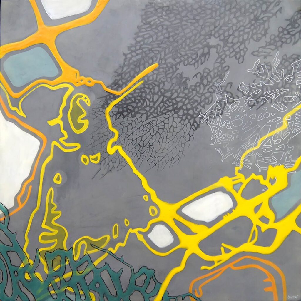 Born in Canada and raised in New Guinea, Betni Kalk’s imagery is inspired by found man-made objects and nature, wresting both realism and expression through her colorful and layered landscapes and abstracts. From a simple walk along a riverbank, or an urban hike, she adapts a variety of materials and imagery to shapes and scenes that draw from her training in graphic design just as naturally as from her upbringing amongst the indigenous peoples of the Pacific. She uses any of a multitude of mediums, including encaustic, ink and graphite, and watercolor.