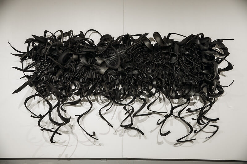 Her piece, “The Color of Hope,” 2010, in its literal use of industrial waste calls the viewer to consider how discarded tires and metal can evoke the appearance of very elaborate calligraphy densely layered.