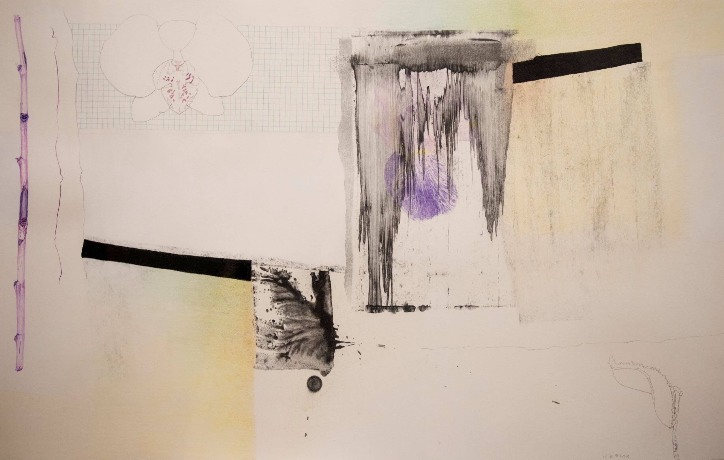David McLeod prefers using a broad range of drawing materials, among them pencils, graphite sticks, pencil, lithographic crayon and gouache, in works that mediate a space somewhere between drawing and painting. In his compositions on paper, such as “Arrangement with Many Inclusions,” McLeod establishes a ground of precise linear elements, such as a graph-paper grid and orchid drawings, as well as washy rectangles of lightly toned color. This diagrammatic stasis then begins to energize, as he exploits the liquid properties of his media to add counterpoints of movement and density.