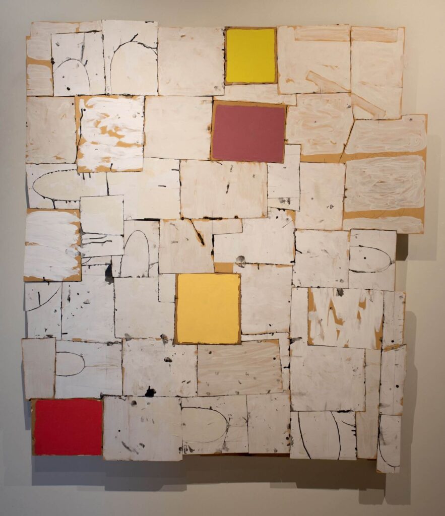Gordon Powell’s art also reads like collage, but he fashions painting-like wall reliefs from abutted pieces of wood. His forms are intentionally casual — wood shapes are irregularly squared — and he uses dyed glue to join their seams, allowing it to ooze through the cracks and make painterly lines. In “Untitled (with 4 colored squares),” Powell has created a kind of informal but effective geometric abstraction, painting his MDF forms mostly white with pops of red and yellow and enlivening the surface with ellipses and spots of blue-dyed glue and pencil.