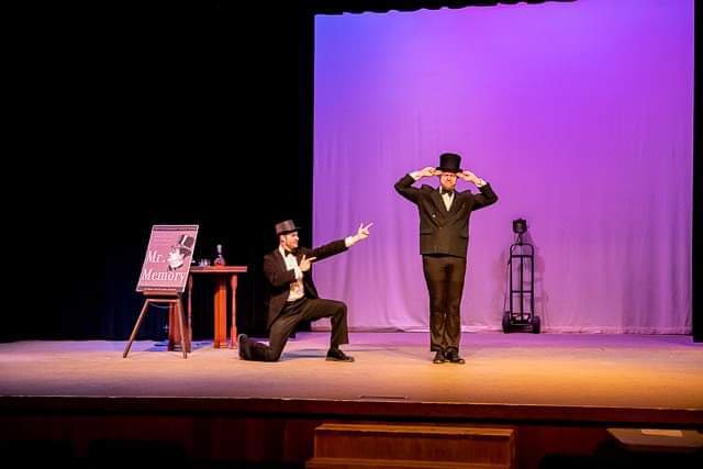 The 39 Steps encapsulates the epitome of the classic whodunit spoof that emanates a pastiche of the film noir era. Everything and I mean everything, is parodied, resulting in a rollicking production of theatrical mastery. The play opened at The Lofte Community Theatre October 12th and is directed by Kevin Colbert. A dynamic talented four comprises the cast: Mike Kruger, Anne Pope, Andrew Schell and Dillon Kirby. So much versatility and theatrics are at play, with adept, pliable characters under the clever guise of hijinks and Hitchcock allusion.