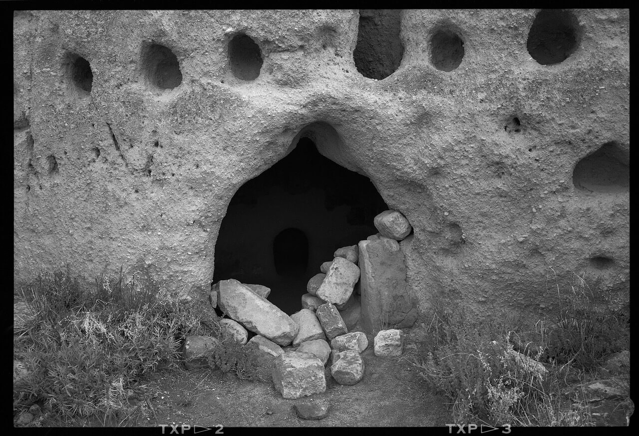 The mystery of these people’s lives and fate is stirred by his emphasis on the deep, dark interiors, and on the patterns and shapes of the openings in the exteriors. The doorways in several of the shots reflect an obvious human form and both natural and deliberate openings in the walls sometimes eerily evoke expressive faces.