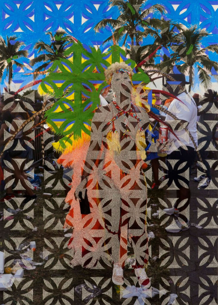 Take, for example, “Untitled, Junction,” the first work on display as you enter the exhibition. It is an image of a sandy coastal view behind a kind of double scrim of a colorful beaded curtain in the foreground and the raised surface design of stripes and triangles. Smith yields no specific clues about the location, leaving it up to the viewer to decide if this is Jamaica, Miami or somewhere generic. The scene, with its dazzling camouflage, nonetheless conjures the idea of tropical heat and the pleasures of the sun and sand viewed through a prism of distance and memory.