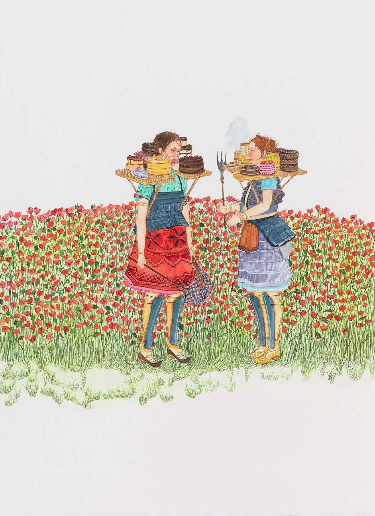 Running concurrently in the Riley CAP Gallery is a solo show of Amy Cutler’s delicate drawings. Known for her spare yet highly detailed renderings, she creates visual mythologies in which female protagonists navigate familiar yet often psychologically dark and physically precarious worlds.