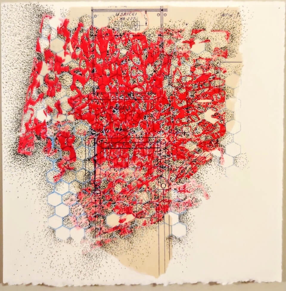 Often starting with found objects like old blueprints, x-rays or city maps, Derek Courtney’s paintings build on layers of color, shape and texture, resulting in fragments of the original content obscured by abstractions of color and shape. His work rises from the concepts behind labor; work vs. compensation, machine vs. human, and action vs. rest.