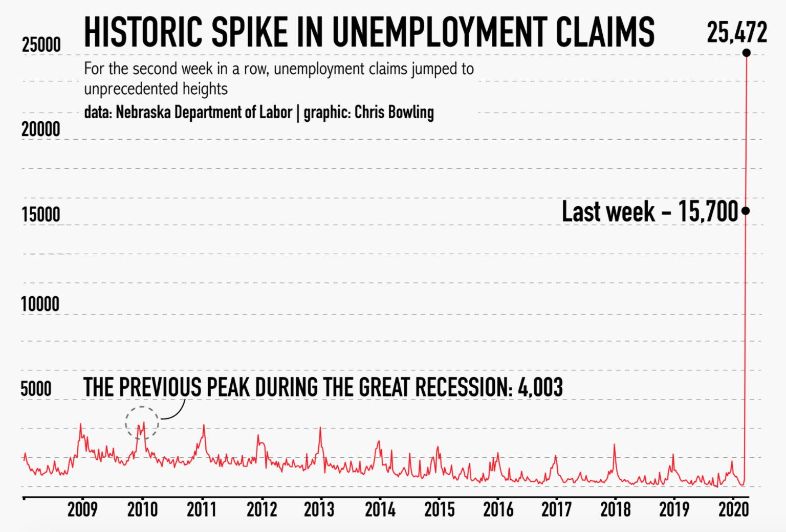 Across the United States 6.6 million people have now filed for unemployment benefit claims, double the last week’s number. In Nebraska more than 25,000 have filed up nearly 9,000 from the week before when the Department of Labor said 40 percent of those claims came from food service employees laid off due to restaurant closures.