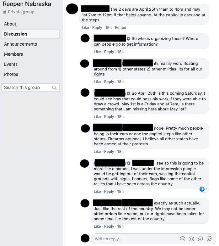 Pictures posted by Media Matters for America, a non-profit conservative media watchdog, show several posts on a group called “Reopen Nebraska” alluding to protests in Lincoln outside the Capitol April 25 and May 1. The names are redacted from the posts but one conversation says attendees can protest from their cars as well as on the steps of the Capitol with signs and flags like similar states.