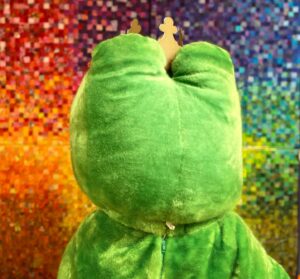 Images of John in a frog costume, an old worn out mascot suit really. Playing guitar, painting his name (“Fhillip”) in pastel colors. Riding a bike. Pointing at a painting of a frog. Holding handmade signs: FREE HUGS. KISS ME AND I TURN INTO A PRINCE.