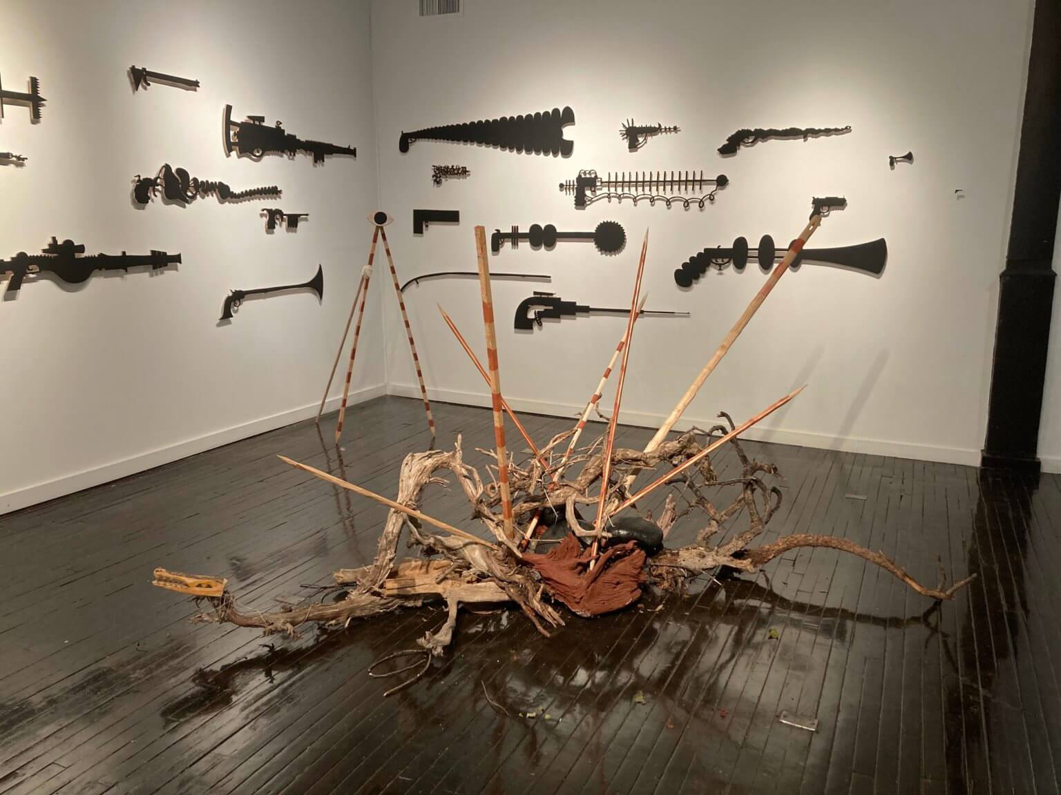 Aiming to deconstruct violence and oppression in our current political and social situation through the intersection of surveillance, weaponry and consumerism, Lincoln-based artist couple Nancy Friedemann-Sánchez and Charley Friedman present new work at The Garden of the Zodiac Gallery. Titled after the infamously designed prison, Panopticon, which continues through Feb. 7, considers how citizens of the United States regulate their own lives in the face of constant surveillance and threat of death by firearm. They successfully accomplish this through a combination of wall and floor sculpture.