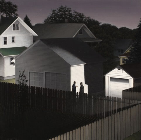 There is always a tantalizing narrative in the keenest of Walkley’s paintings, in which our views into the life inside cozy neighborhoods are cut off by hills, separated by covered walkways and obscured by closed interior doors. Generally small in format, Walkley’s paintings nonetheless convey a great deal of information, atmosphere and mystery.