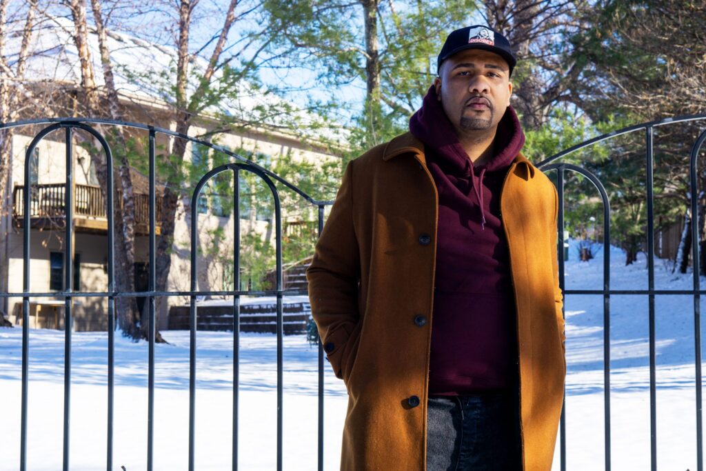 The geometry of the police headquarters’ exterior juts overhead as “Bear” Alexander Matthews steps through the snow.