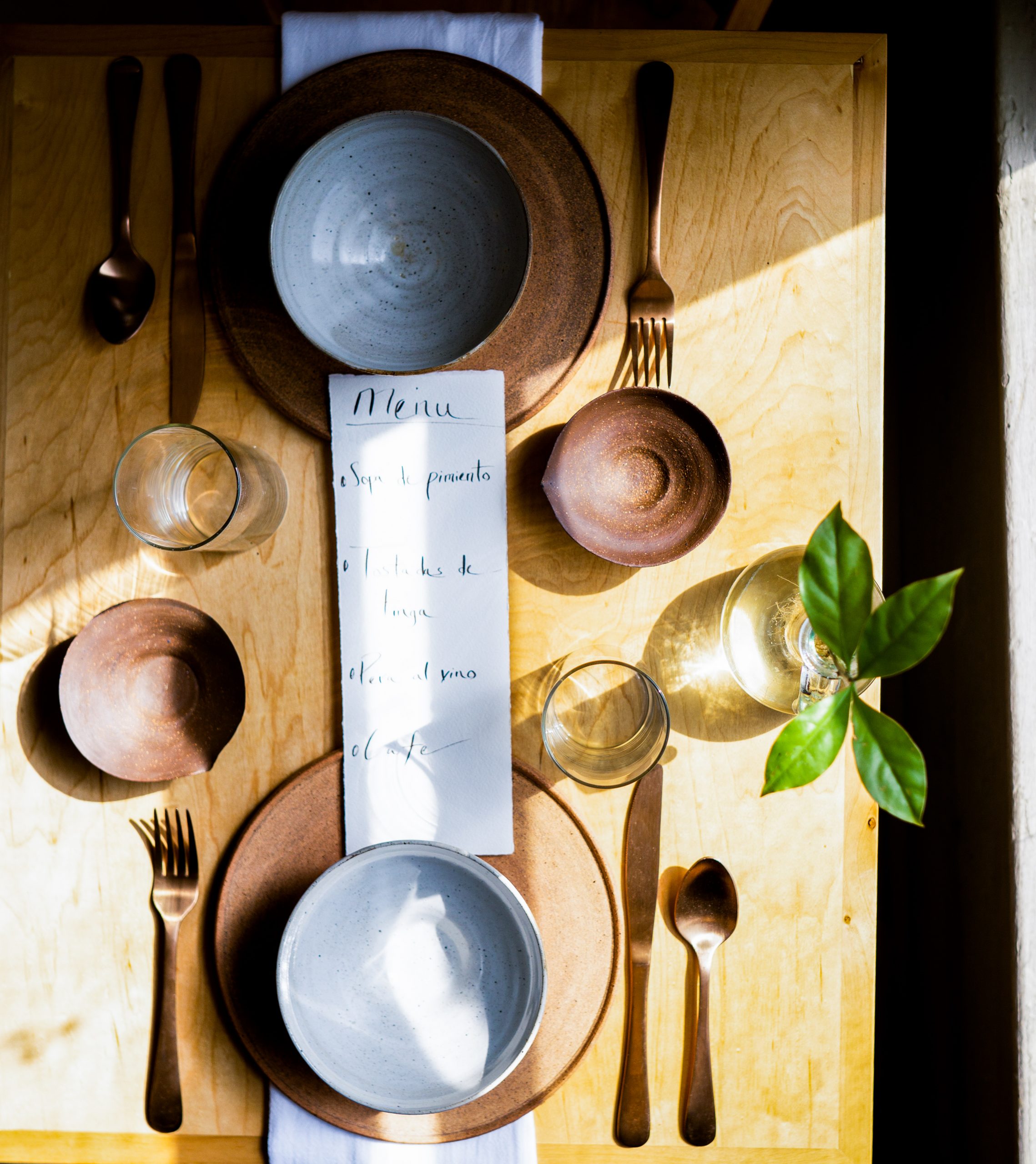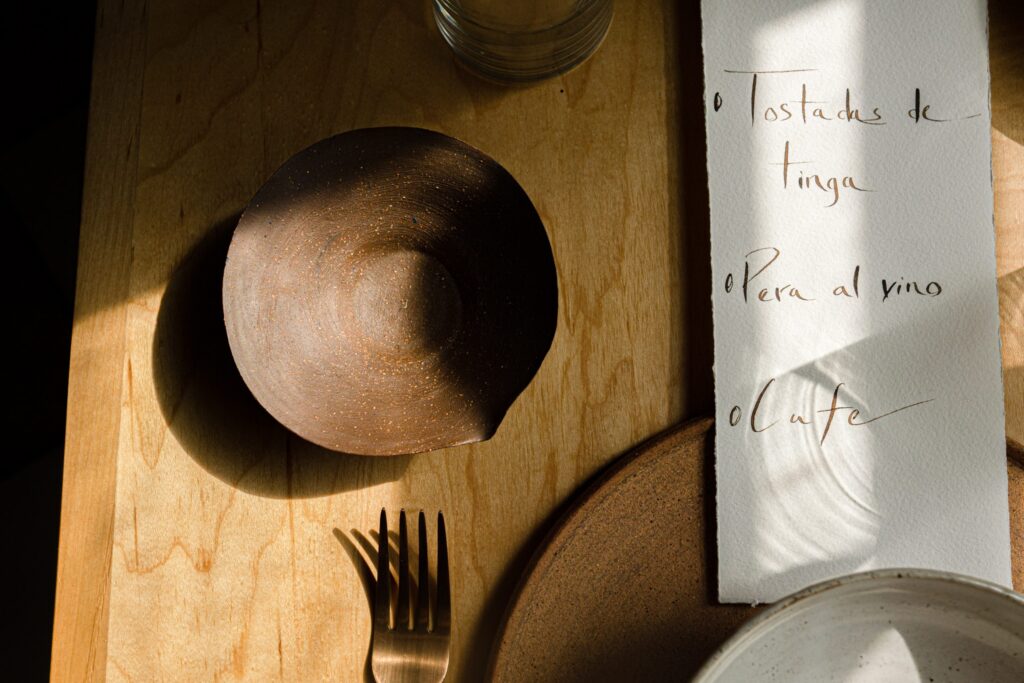 He sat down again at the pottery wheel to make the textured clay plates. He found some light-colored wood chairs at the thrift store. A friend made the table tops. Iridescent silverware came from Walmart. All the glassware was donated by a neighbor.