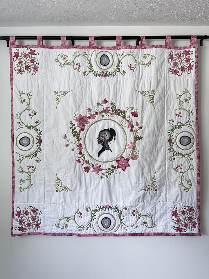 At the very center of the composition is a side-profile of the artist rendered in such detail that viewers can make out here eyebrows and strands of disheveled hair. What makes this profile distinct from the other scans is Talbitzer highlighted sections of her nervous system with pink embroidery made to look like veins. Symmetry is of the utmost importance with this quilt, with repeating floral patterns on the central axis.