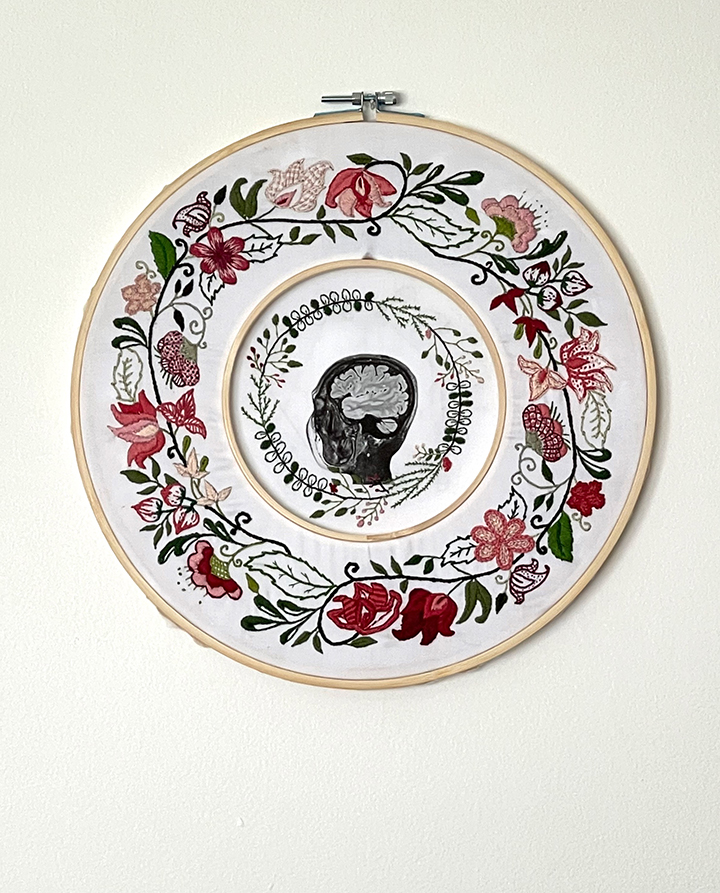 “After some research and a lot of trial and error I successfully printed one of my MRI images onto fabric using my photographic inkjet printer.  If my brain was not visually special on its own, I was going to make it special by embroidering flowers around it.”