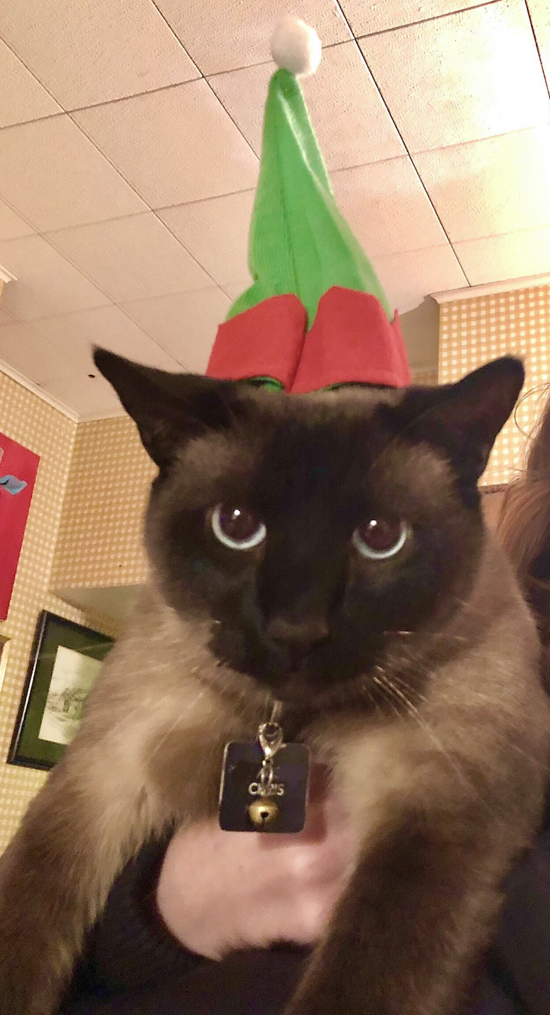 Happy National Dress Up Your Pet Day: Today’s news thinks every pet should dress for success and strut its stuff. Photo below: Omaha-based cat Kevin Bowling dons an elf hat during the holiday season. According to Kevin’s human, News Editor Chris Bowling, “He is Santa’s worst little helper.”