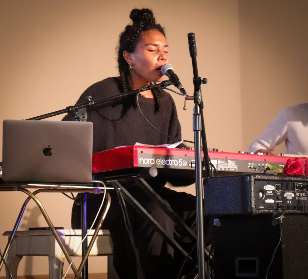 Lawson performing at Holy Family Community Center earlier this summer. Photograph by Isa Luzarraga.