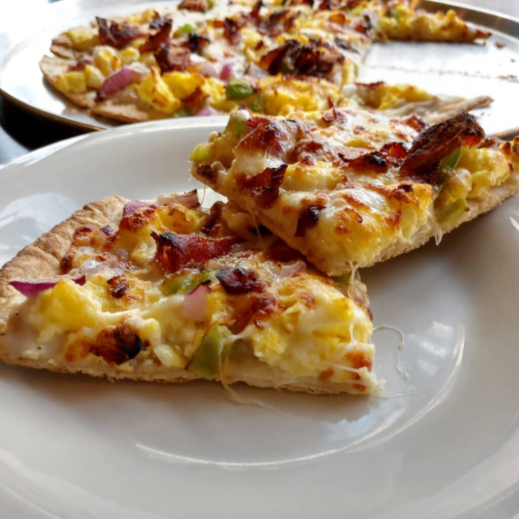 candied bacon and a thin crust pizza with sausage gravy, scrambled