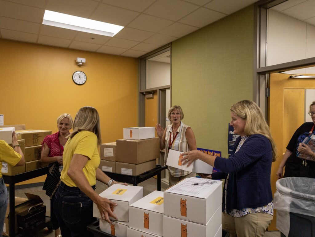 Alpaca employees prepare to distribute the “Alpaca packs” to teachers at Omaha’s Western Hills Magnet Elementary. Photo by Jazari Kual/Flatwater Free Press.