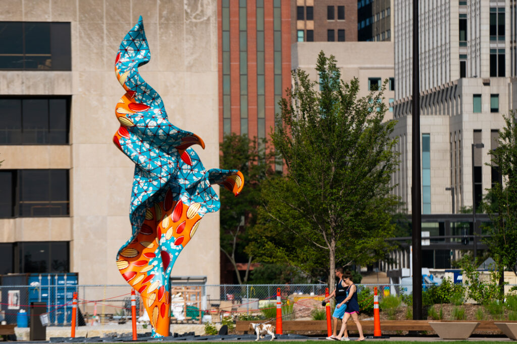 One work outside of Grot’s curatorial domain is a piece by the internationally renowned British-Nigerian Artist Yinka Shonibare which sits to the very west end of the park. Taken as a whole, the sculptures feel very… “Omaha”. They’re easy, kind of like how it feels to live in this big city. They are non-offensive sculptures that just exist as backdrops for parents pushing kids in strollers.