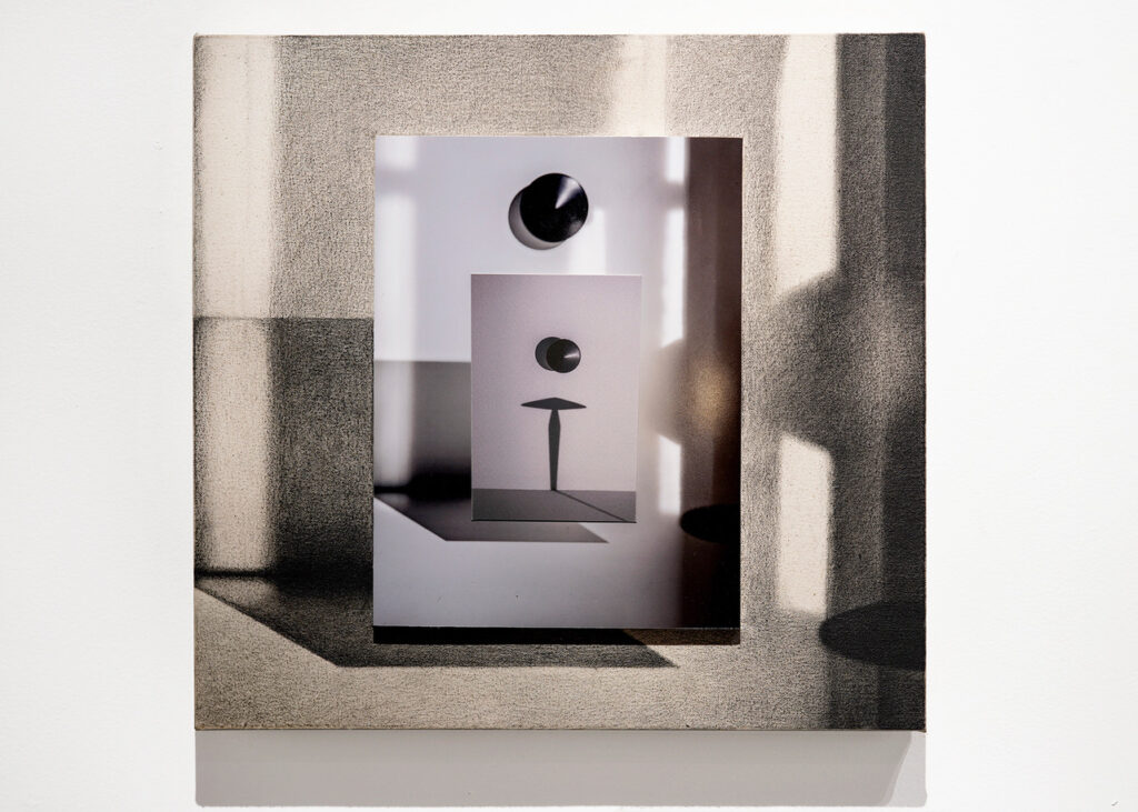 The central photo, collaged or not, is by itself a strong minimalist image, but the surrounding drawing joins it back the themes of the show. This style of repetition framing, reduction and expansion of the light/shadow elements within the original scene, is right at home here, and rendered without pretense.