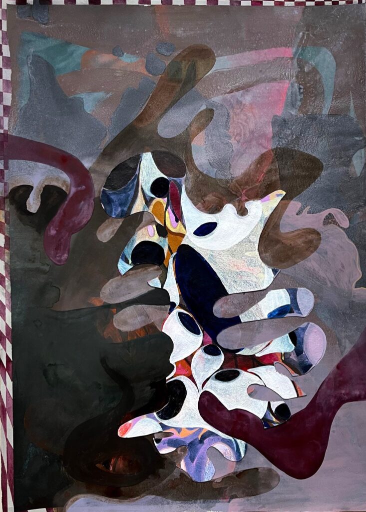 Both painters and printmakers, they found kinship not only in their shared loves of medium, process and botanical subjects, but also in the ways their own works pivoted around the slipperiness of memory and the chaos of uncertainty. They describe their collaboration as exploring “a canopy of weirdness” through complex layered, distorted and biomorphic mixed media works reflecting their balancing act of psychic and aesthetic concerns.