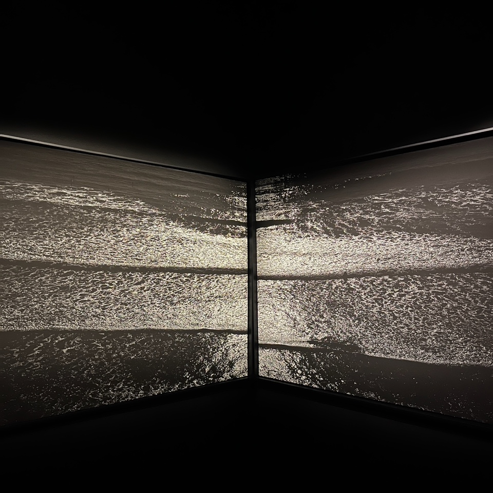 Within a slight lull of perception, you discern a poetic, but slightly disconcerting, ballet of sweeping images of waves, and ocean sounds played against stark, flat-black, indistinguishable voids of walls and ceilings.