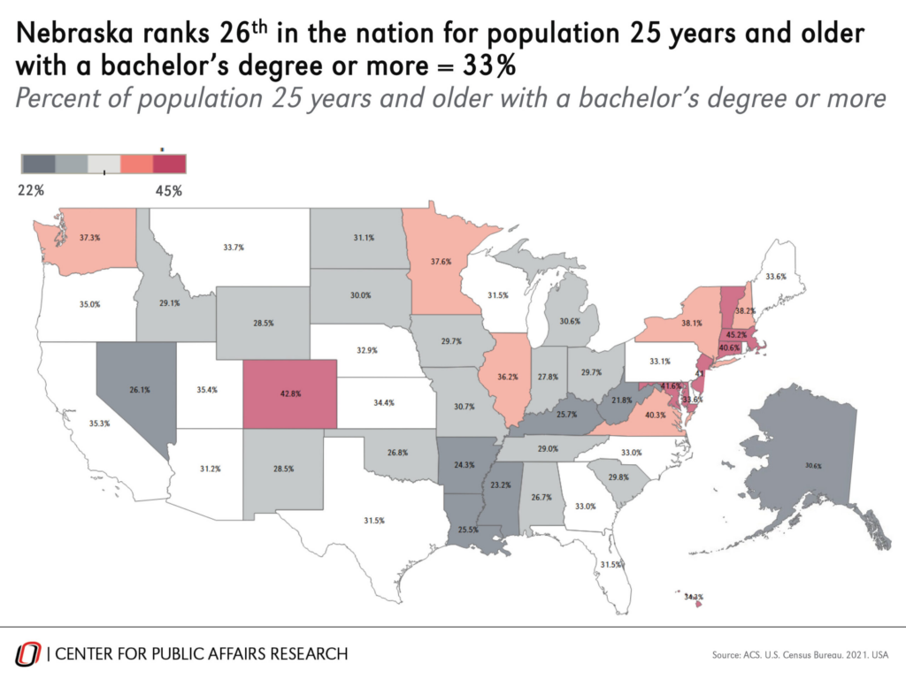In terms of college degrees, she said Nebraska currently ranks in the middle of the nation, 26th among states, for people 25 years and older with a bachelor’s degree.