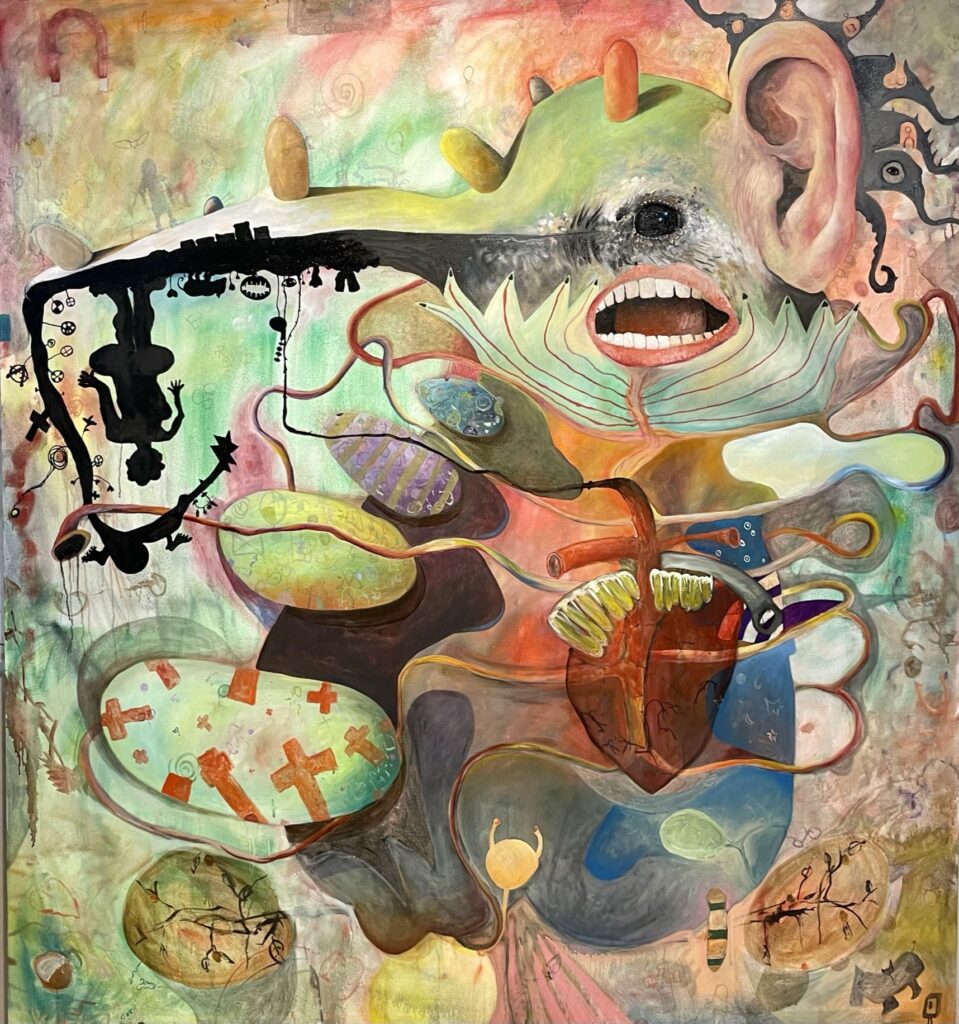 In his first show in many years comprised entirely of oil paintings, Broghammer begins with a familiar aviary, reimagining a favorite of late, the hummingbird. He’s exaggerated their pointy beaks, painting them inky black and turning them into long, twisty roads traveled by silhouetted characters. They have visibly human organs—big ears, biting teeth, twisted colons—and are surrounded by Broghammer’s trademark enigmatic iconography, relating a story only he is privileged to decipher fully. Their appearance is as aggressive as it is intentionally and wonderfully strange.